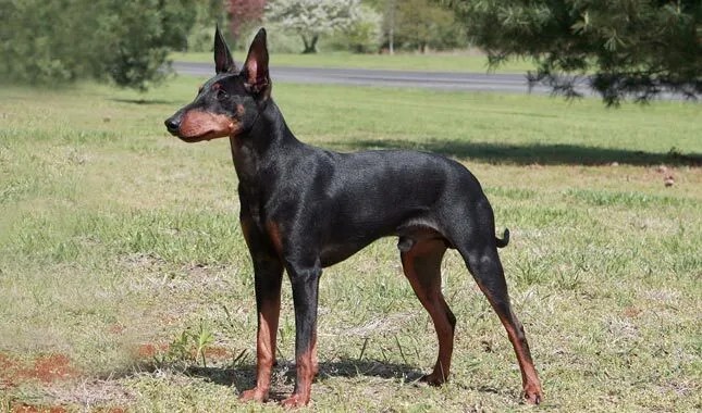 The Manchester Terrier is one of few dogs in the terrier group whose roots lie in the urban jungle. Streetwise, alert and taking no prisoners, he is a slick dog with an outline of whippet in his makeup. His sleek black coat with tan features is low maintenance and, so long as he has company and sufficient daily exercise, is well adapted to city life. Game yet independent, this breed makes a bright companion. The rats of Manchester had better watch their backs!