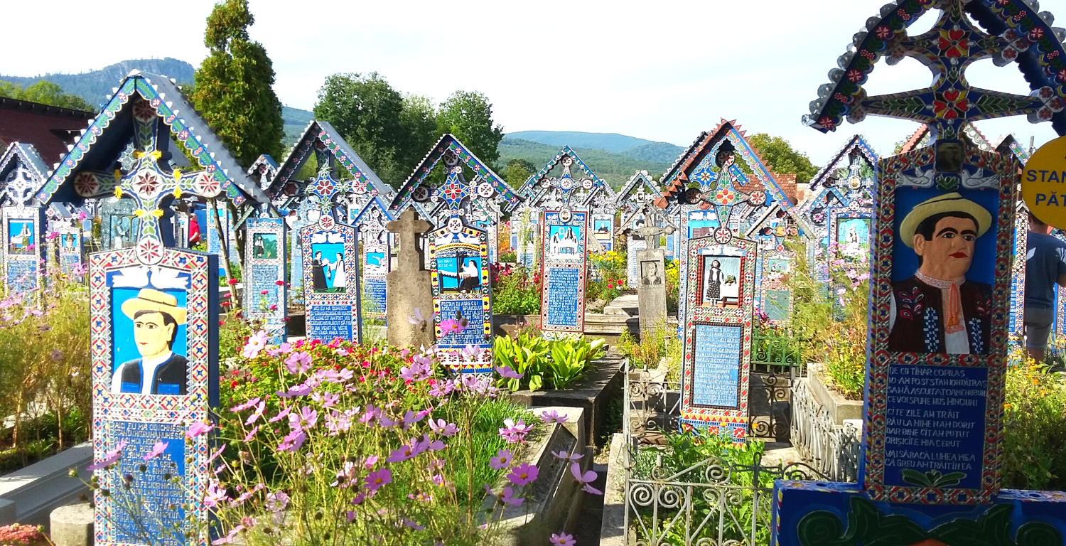 The Cimitirul Vesel or the Merry Cemetery of the little village of Sapanta, in Maramures County in Romania, though tell a very different story of death. The vibrantly coloured tombstones, with child-like drawings and little poems, have become a place for international tourism. In 1935, a local artist Stan Ioan Patras listened to villagers at the local watering hole sharing stories about a recently deceased person and sculpted the first multi-coloured cross for a tombstone with the story as a poem. Since then this has been the tradition of the village. After he passed away in 1977, his protégé Dumitru Pop-Tincu continues this work.