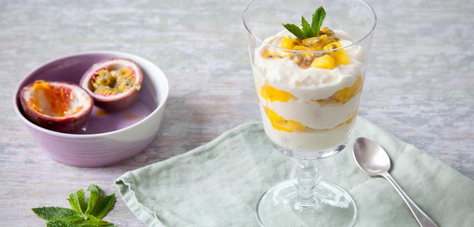 - Spoon a layer of the meringue mixture into the bases of four serving glasses. Sprinkle over a handful of mango pieces and drizzle with the passion fruit seeds. Repeat until all the meringue mixture and fruit is used up.