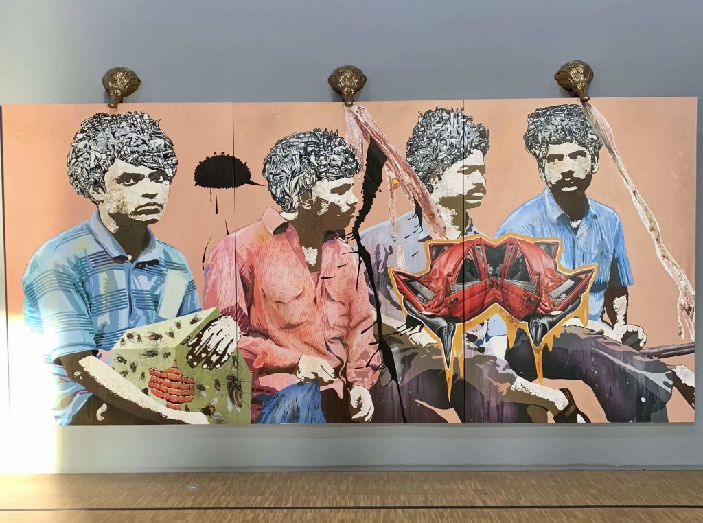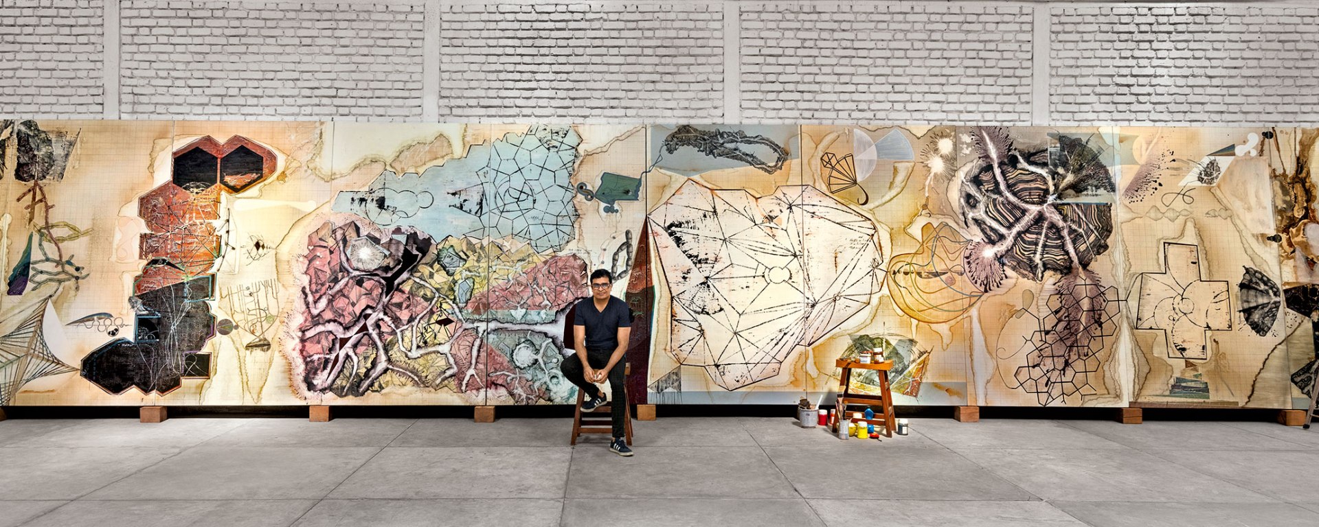 He cites a broad range of influences, from Pop art and Dada to Persian miniatures and billboards, coalescing in a distinctive handmade aesthetic. His series of paintings “Dawn Chorus” (2007) feature street children whose heads of hair are depicted as black-and-white city scenes, teeming with people and vehicles.