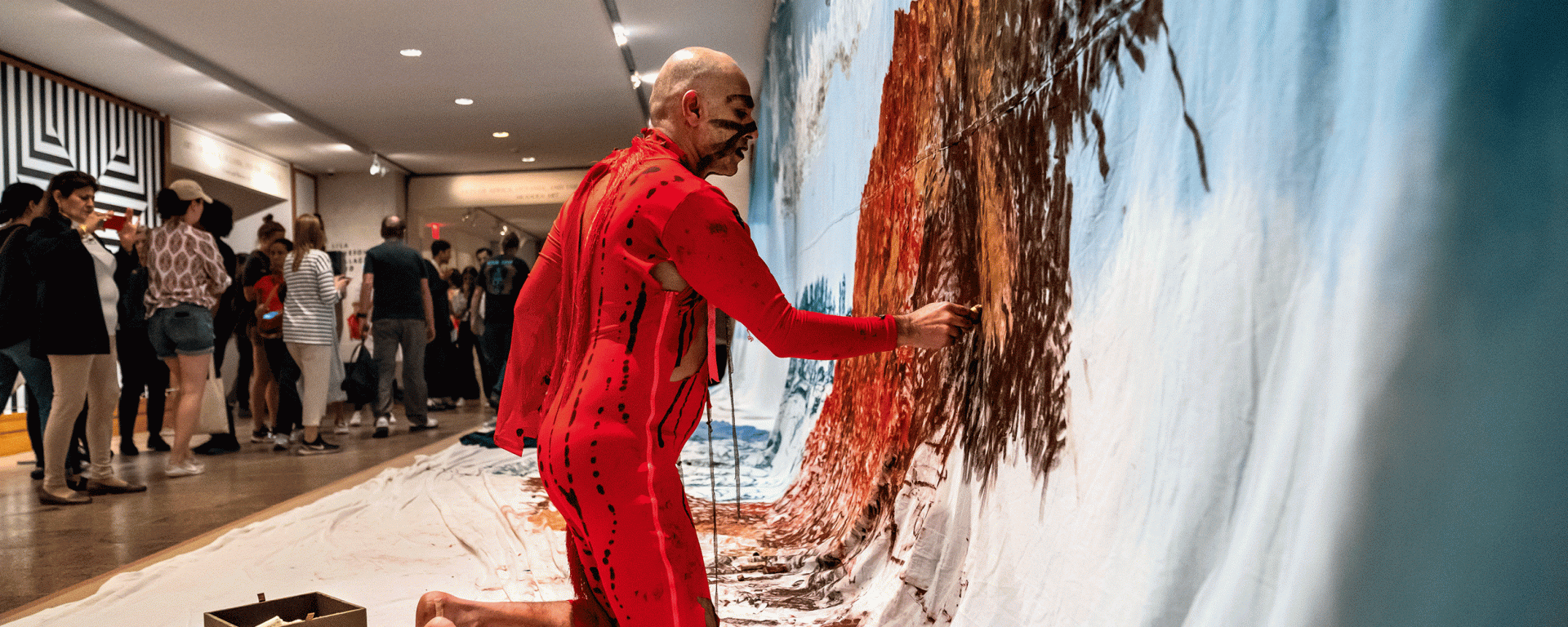 Nikhil Chopra has performed and exhibited his art before a global audience since the mid-2000s. His art has featured in gallery and institutional shows, art fairs, and other major art events worldwide. In the live performance Lands, Waters, and Skies (2019), the artist worked in the galleries of The Metropolitan Museum of Art for nine consecutive days, adopting various personae and critically engaging with the museum’s collection and its organisational principles.