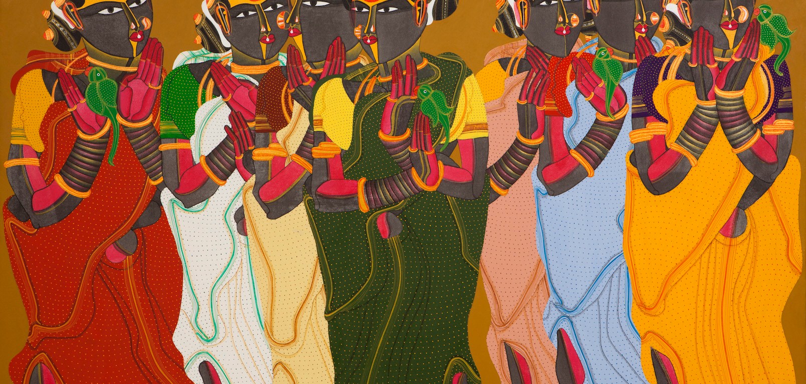 Thota Vaikuntam is known for his contemporary figurative paintings of residents of the Telangana region of India. His stylized portraits—which focus on their subjects’ garments and accessories—have earned him many awards, including the Bharat Bhavan Biennale Award in 1999 and the National Award for Painting from the Government of India in 1993.