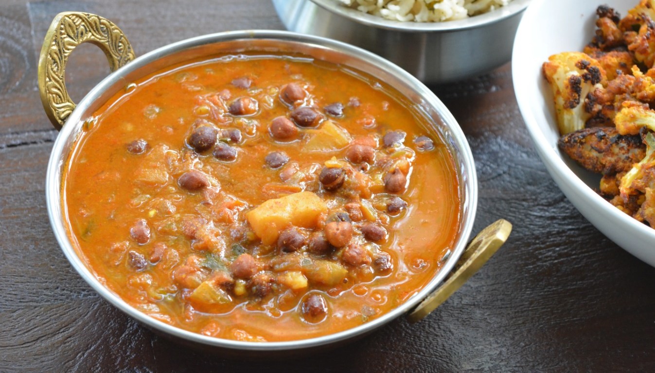 - Stir chickpeas, potatoes, 1 teaspoon salt, coriander, garam masala, turmeric, and cayenne pepper into onion-cumin mixture; add 2 cups water. Bring liquid to a boil and cover pot; reduce heat and gently simmer for 1 hour. Stir tamarind paste into chickpea mixture; cook, stirring occasionally, for 10 minutes more.