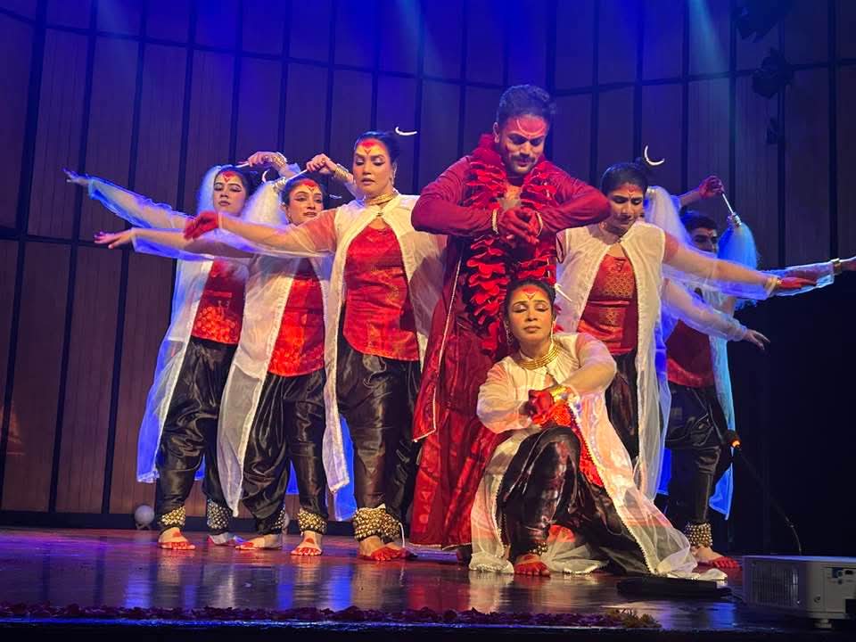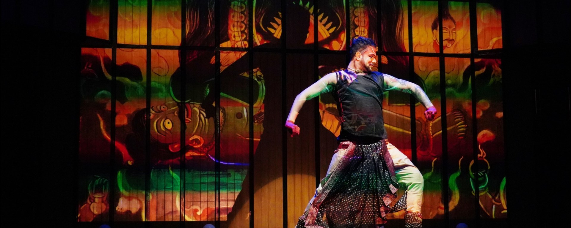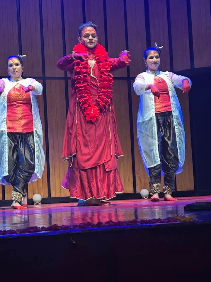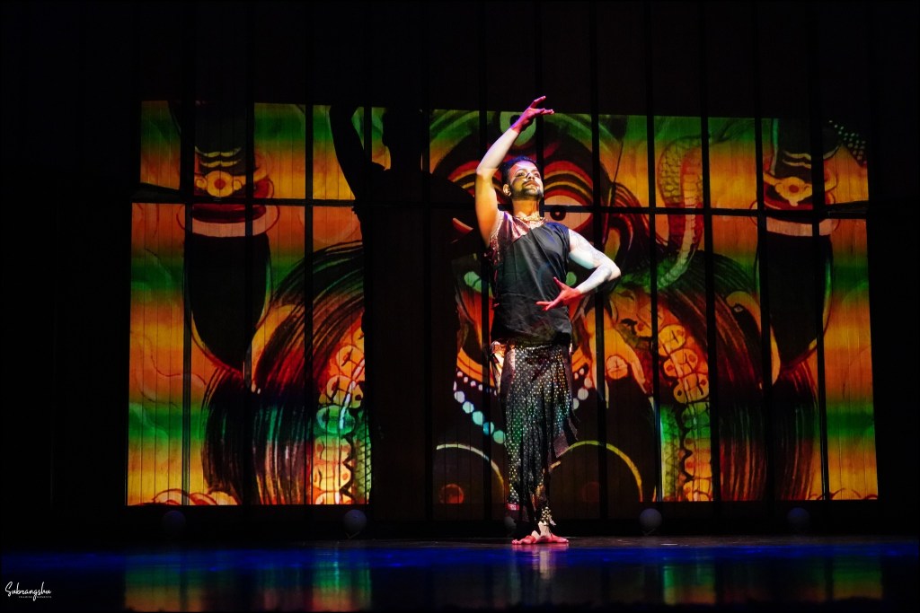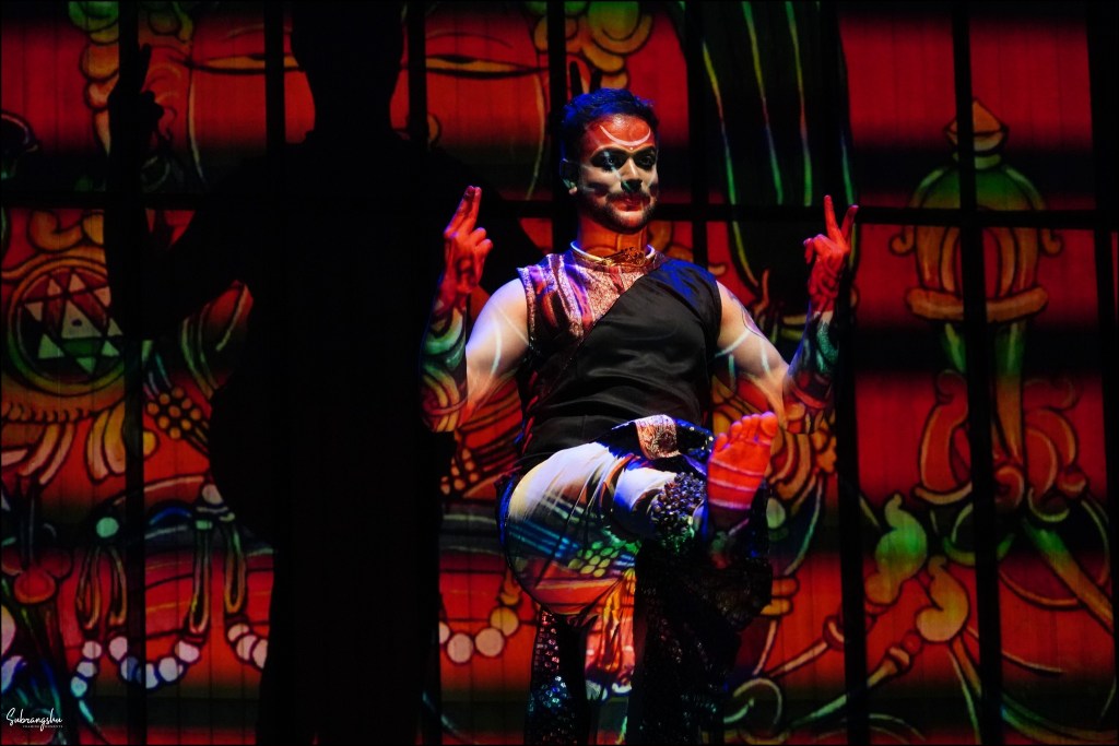 The technical brilliance of the show was undeniable. Using the “Wash and Tempera” technique, each deity’s visage was splashed onto the screen that formed the stage’s backdrop, while performers enacted the narrative. Barun Kar’s impeccable lighting and Arghyadipta Kar’s film projections synchronized seamlessly, heightening the surreal impact of the piece.