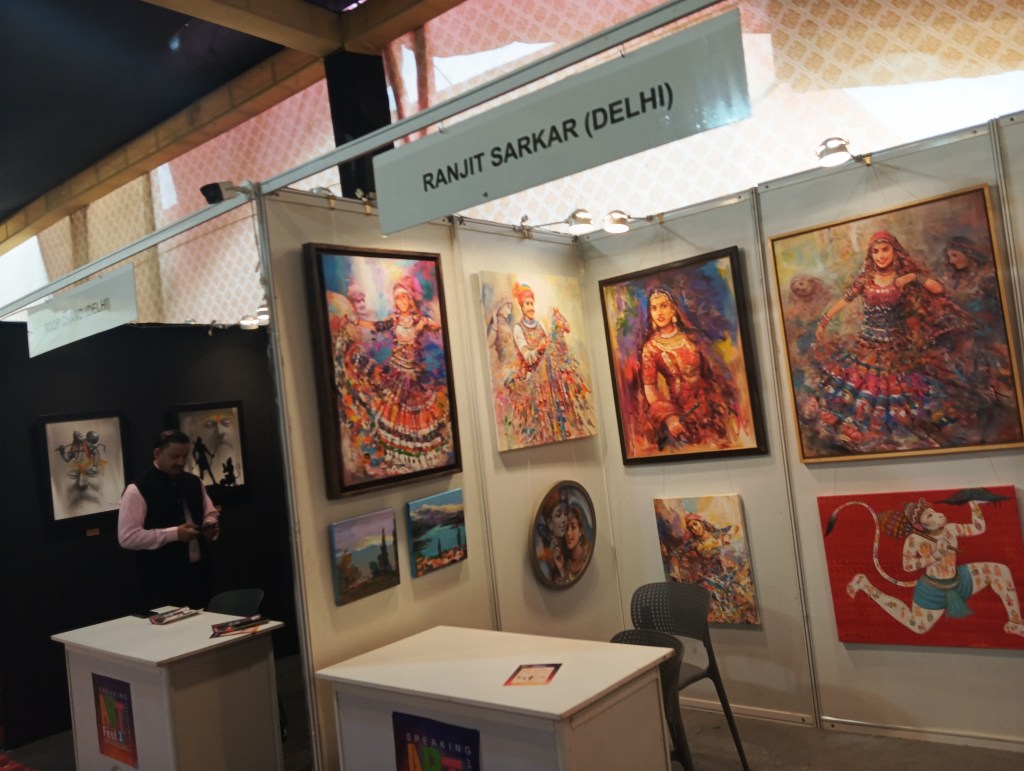 The moment I stepped into the pavilion, I was greeted by a vibrant, flamboyant riot of colours, hues, lights, and shades, all juxtaposed with diverse aspects of visual art. As I moved from one stall to another, I was awestruck by the immense variety of subjects, motifs, themes, images, shapes, sizes, and designs. In fact, I was struck by the sharp contrast from one artwork to another. You name it, and it was there on the numerous canvases lining the stall walls: pets, horses, camels, domestic scenarios, rustic Rajasthani women in traditional attire and jewellery, the smiling faces of children, and more.