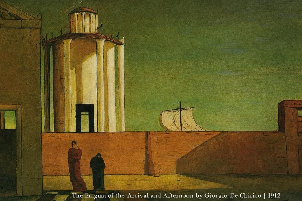 Firstly, I would request all of you to turn towards this painting on the large screen, titled ‘The Enigma of Arrival’ by the Italian metaphysical painter Giorgio de Chirico from 1912. It is the cover of a rather famous book by a Nobel laureate author. Any guesses?